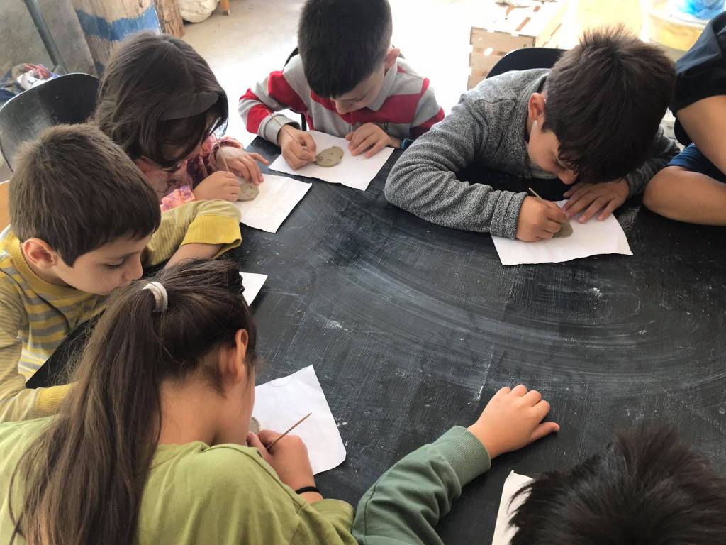 2․1 դասարանի սովորողները ընկեր Ալիսի օգնությամբ սովորում են դիմաքանդանդակ ծեփել սպիտակ կավով։