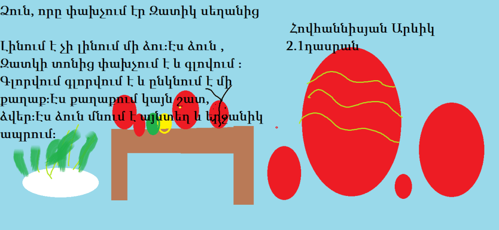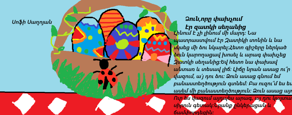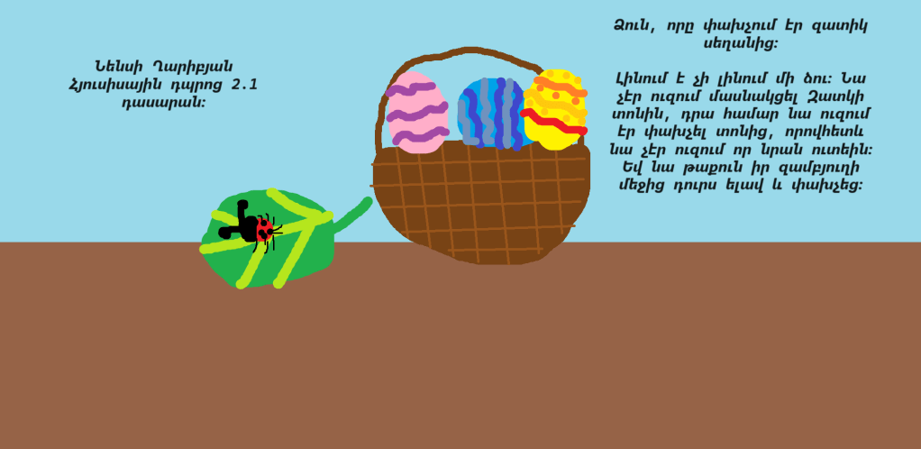 «Զատիկ» ուսումնական նախագծի շրջանակում սովորողները ծանոթանում են Սուրբ Զատիկի տոնին, ծիսական սովորույթներին ու ուտեստներին:Այս ամենի մադին զրույց անելուց հետո, մտածեցին, թե ինչ կլիներ, եթե հանկարծ Զատկի սեղսնին ձու չլիներ և ձու որոշեր փախչել:Հորինուկները ստորև`