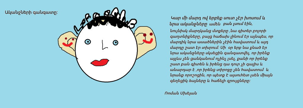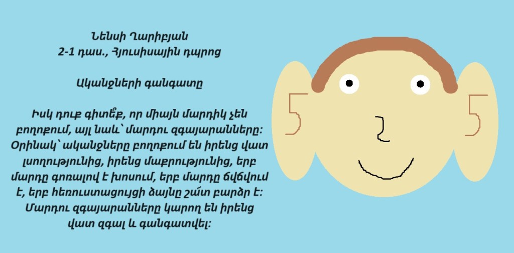 Սովորողների հետ ծանոթացանք Ջաննի Ռոդարիի «Աչքերի գանգատը» ստեղծագործությանը, քննարկեցինք և հորինեցինք հորինուկներ«Ականջների գանգատը» վերնագրով: