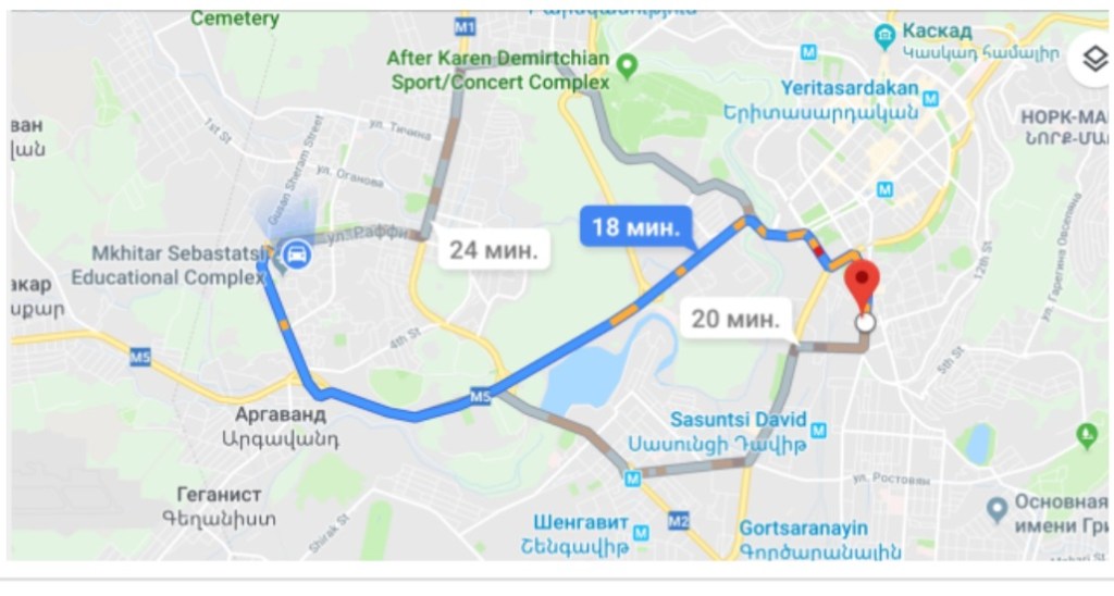 Ճանապարհ— Րաֆֆու փողոց- Բաբաջանյան փողոց — Ծովակալ Իսակովի պողոտա- Հաղթանակի կամուրջ- Արգիշտի փողոց — Գրիգոր Լուսավորչի փողոց — Ագաթանգեղոսի փողոց- Տիգրան Մեծի պողոտա