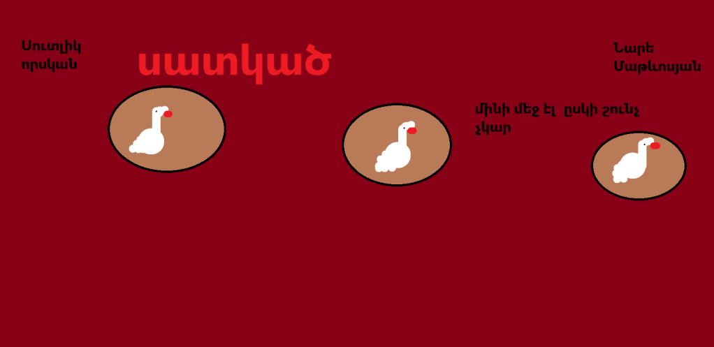 Մի օր գնացի մի գյուղ, մին էլ տեսնեմ երեք մարդ վիճում են, երկուսը՝ մեռած են, մինն էլ իսկի չի խոսում։ Էս մարդիկ գոռգոռում են, իրար հայհոյում։