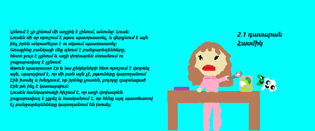 Սովորողների հետ շրջեցինք Հյուսիսային դպրոցի բակում, վայելեցինք դպրոցի աշունը, ներկայացրեցինք Հովհաննես Թումանյանի <<Աշուն>> բանաստեղծությունը։Վերջում հավաքեցինք գեղեցիկ գունավոր տերևները, որպեսզի պատրաստենք տարբեր հետաքրքիր կերպարներ։Արդյունքը շատ գեղեցիկ էր։