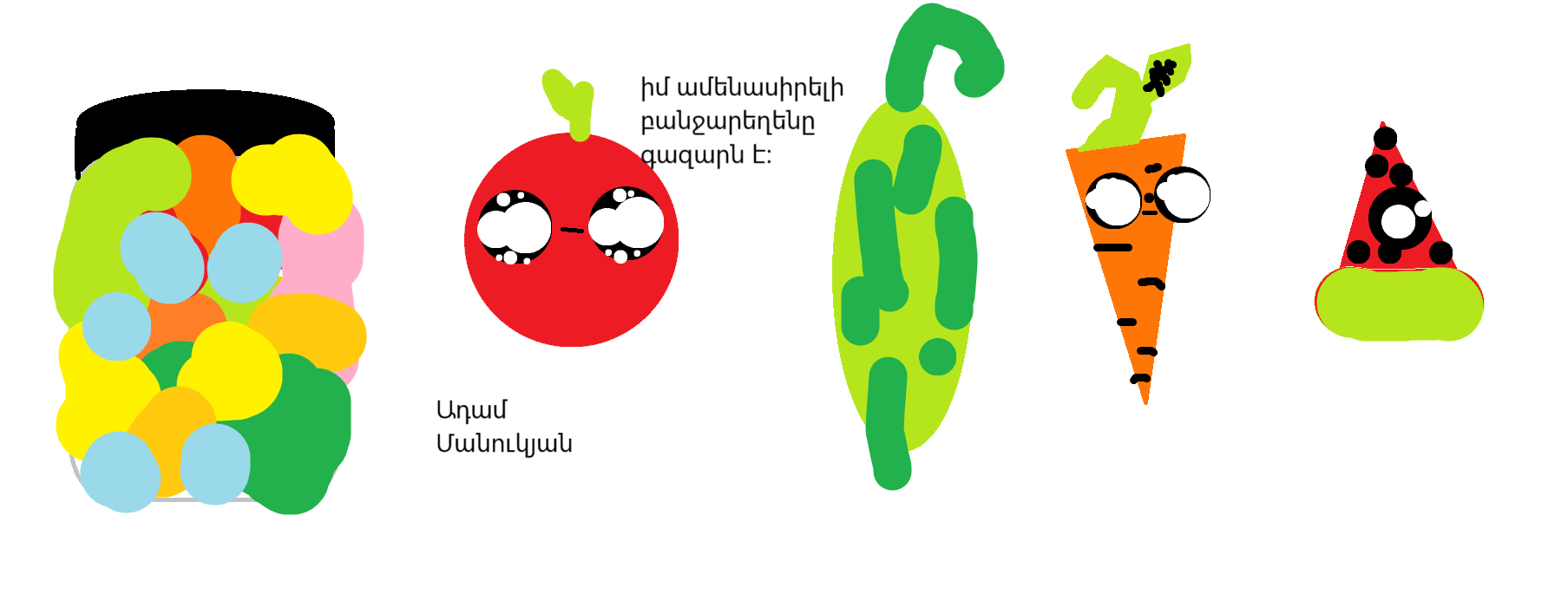 քաղցրավենիքներից : Իսկ մեր դպրոցը շրջապատված է տարատեսակ ծառերով ,որոնց վրա քաղցրավենիք է աճում:Երբ անձրև է գալիս,ջրի կաթիլների փոխարեն ադի բուդի է թափվում երկնքից:Այն աշխարհի ամենալավ դպրոց-գործարաններից մեկն է, որովհետև օրուգիշեր աշխատում է արտադրել աշխարհի ամեաորակյալ ու ամենահամեղ քաղցրավենիքները մեզ համար: